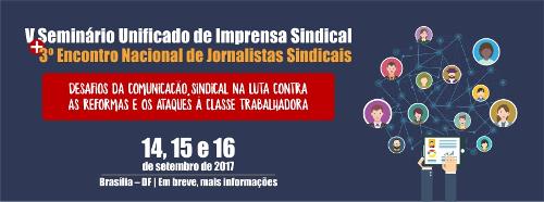 Nos dias 14 e 15 de setembro, será realizado em Brasília (DF) o V Seminário Unificado de Imprensa Sindical, que tem como público-alvo dirigentes sindicais, profissionais da imprensa, estudantes e os demais interessados em fazer a disputa de hegemonia via comunicação sindical. No dia seguinte (16), ocorrerá o III Encontro Nacional de Jornalistas Sindicais.